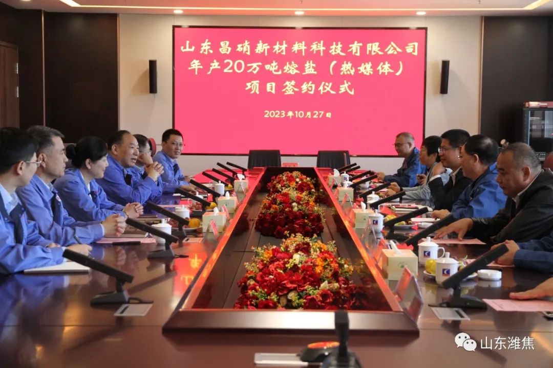 10月27日上午10:58分,山東昌硝新材料科技有限公司20萬噸/年熔鹽(熱媒體 )項(xiàng)目合作簽約儀式在集團(tuán)總部舉 行。濰坊昌盛硝鹽投資公司董事長牟紅光、濰坊振興日升公司總經(jīng)理劉峰祥作為合作雙方代表進(jìn)行簽約。朱劉街道黨工委書 記董建濤、昌樂縣化工產(chǎn)業(yè)發(fā)展服務(wù)中 心主任王俊鳳,集團(tuán)董事長劉良玉、副總經(jīng)理呂紅,濰坊昌盛硝鹽投資控股公司負(fù)責(zé)人牟邦志等出席簽約儀式。簽約儀式由集團(tuán)公司總經(jīng)理王讀福主持。